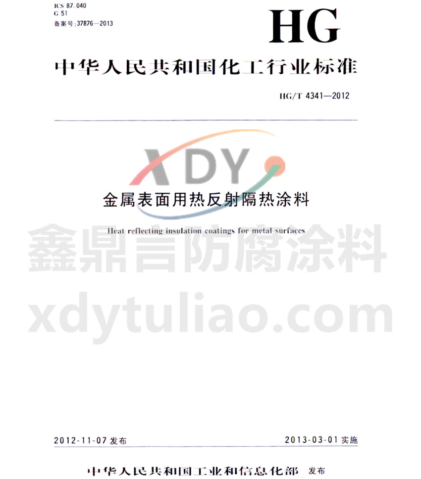 HG/T 4341-2012金屬表面用熱反射隔熱涂料標準 ICS 87.040 G51 備案號:37876-2013 HG 中華人民共和國化工行業標準 HG/T4341-2012 金屬表面用熱反射隔熱涂料heat reflection coatings for metal surfaces 2012-11-07發布 2013-03-01實施 中華人民共和國工業和信息化部發布 本標準規定了金屬表面用