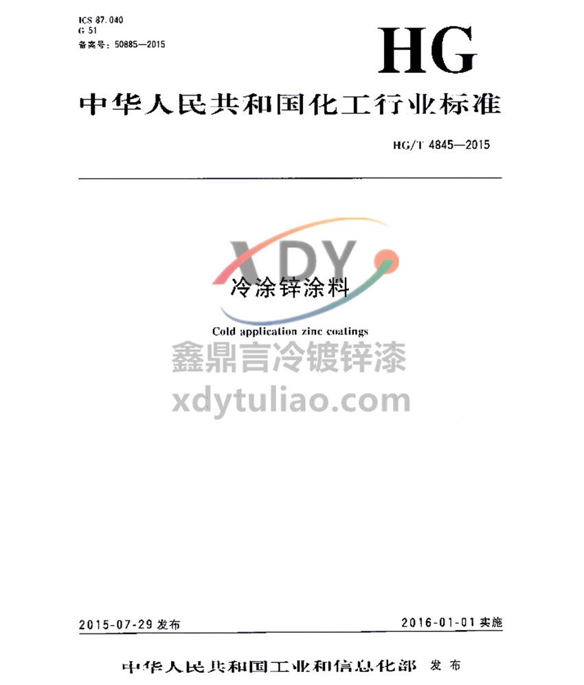 HG/T 4845-2015冷涂鋅涂料標準 備案號:50885-2015 中華人民共和國化工行業(yè)標準 HG/T 4845-2015 冷涂鋅涂料Cold application zinc coatings 2015-07-29發(fā)布 2016-01-01實施 中華人民共和國工業(yè)和信息化部發(fā)布 本標準適用于常溫施涂的高鋅含量的有機涂料。該產品是由鋅粉、有機樹脂、溶劑等組成的單組分涂料,主要用于鋼鐵底材暴