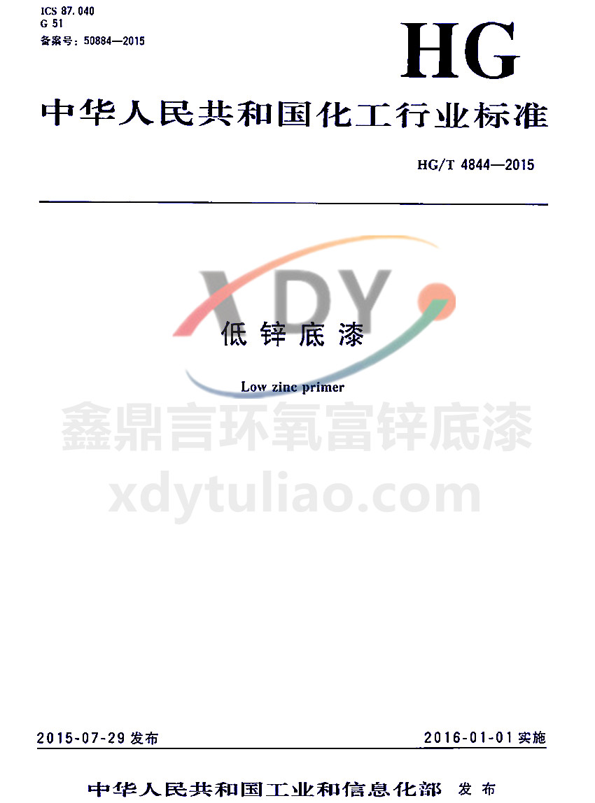 ICS 87.040 G51 備案號:50884-2005 HG 中華人民共和國化工行業(yè)標準 HG/T 4844-2015 低鋅底漆Low zinc primer 2015-07-29發(fā)布 2016-01-01實施 中華人民共和國工業(yè)和信息化部 發(fā)布 本標準規(guī)定了低鋅底漆的產品分類、要求、試驗方法、檢驗規(guī)則、標志、包裝和貯存。本標準適用于不揮發(fā)分中金屬鋅含量低于60%但不低于40%的低鋅涂