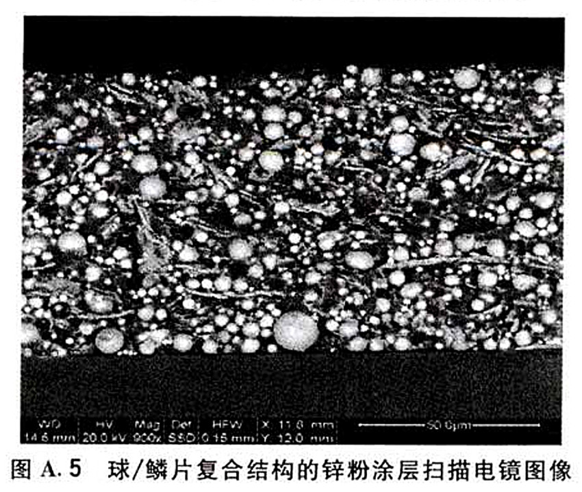圖A.5 球/鱗片復合結構的鋅粉涂層掃描電鏡圖像