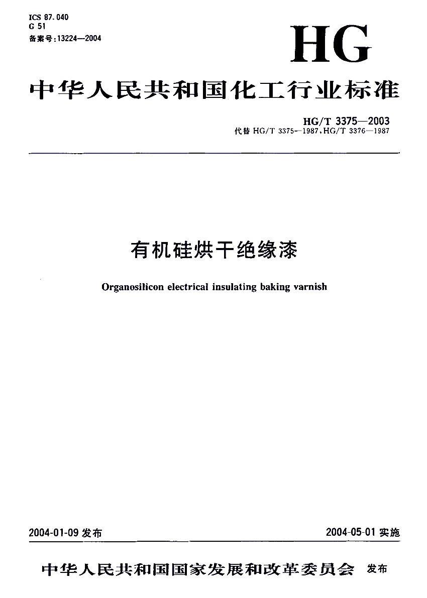 HG/T 3375-2003有機硅烘干絕緣漆標準 ICS87.040 G51 備案號:13224-2004 HG 中華人民共和國化工行業標準 HG/T 3375-2003代替 HG/T 3375-1987,HG/T 3376-1987 有機硅烘干絕緣漆Organosilicon electrical insulating baking varnish 2004-01-09發布,2004-
